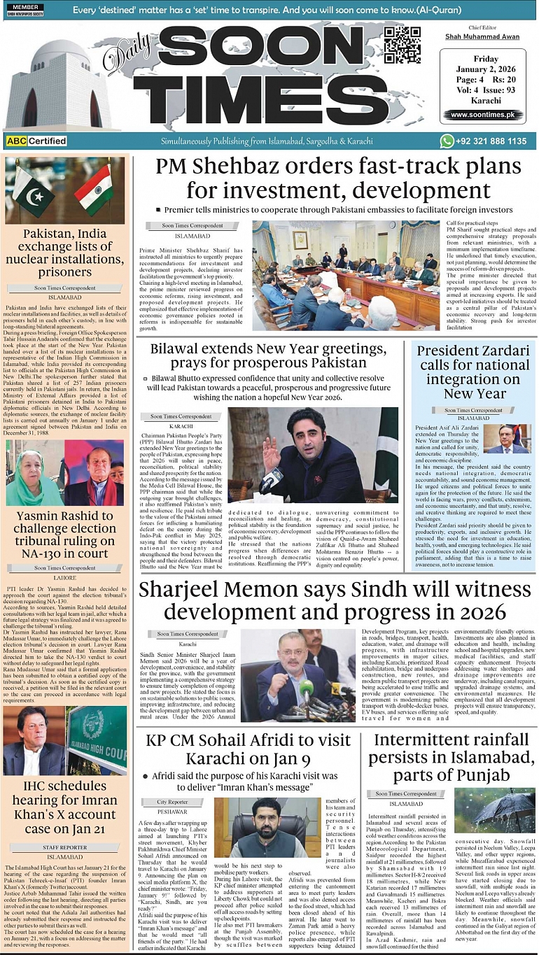 Daily Soon Times January 02, 2026 Daily Soon Times today's ePaper leading English national newspaper from Islamabad, Sargodha, Karachi, Pakistan << First << 1 >> Last >> Page 1Page 2Page 3Page 4 × Daily Soon Times 1k23k4 1k23k4 1k