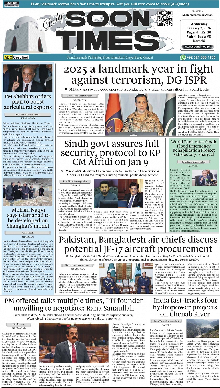 Daily Soon Times January 07, 2026 Daily Soon Times today's ePaper leading English national newspaper from Islamabad, Sargodha, Karachi, Pakistan << First << 1 >> Last >> Page 1Page 2Page 3Page 4 × Daily Soon Times 1k23k4 1k23k4 1k