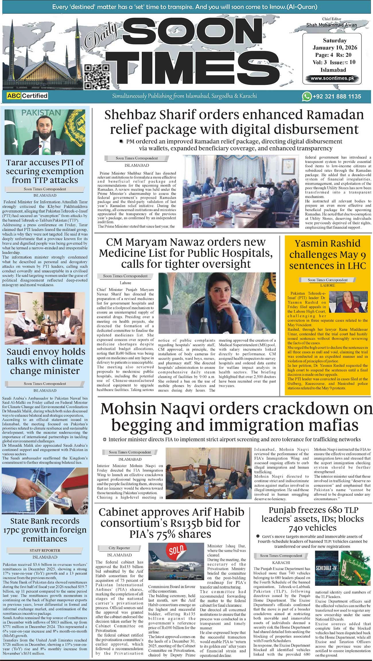 Daily Soon Times January 10, 2026 Daily Soon Times today's ePaper leading English national newspaper from Islamabad, Sargodha, Karachi, Pakistan << First << 1 >> Last >> Page 1Page 2Page 3Page 4 × Daily Soon Times 1.234 1.234 1.