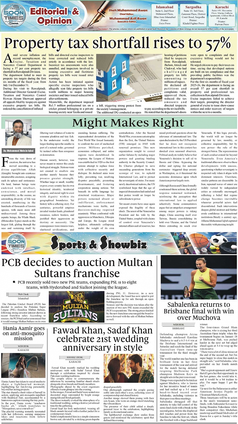 Daily Soon Times Page: 2 January 12, 2026 Daily Soon Times today's ePaper leading English national newspaper from Islamabad, Sargodha, Karachi, Pakistan << First << 2 >> Last >> Page 1Page 2Page 3Page 4 × Daily Soon Times 1234 1234 2