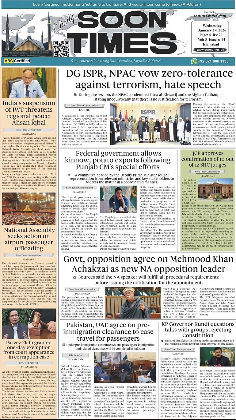 Daily Soon Times January 14, 2026 Daily Soon Times today's ePaper leading English national newspaper from Islamabad, Sargodha, Karachi, Pakistan << First << 1 >> Last >> Page 1Page 2Page 3Page 4 × Daily Soon Times 1.234 1.234 1.