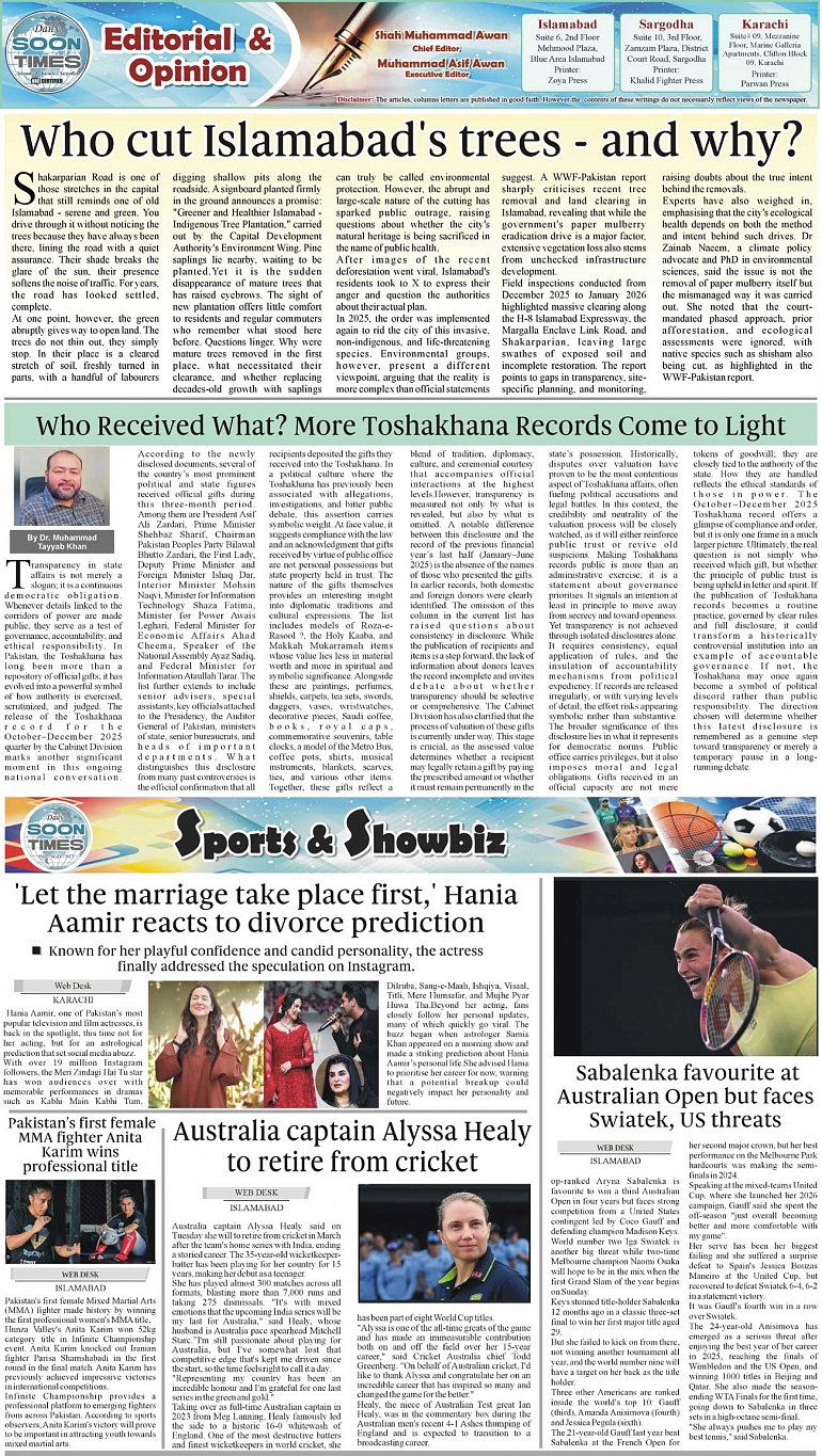 Daily Soon Times Page: 2 January 14, 2026 Daily Soon Times today's ePaper leading English national newspaper from Islamabad, Sargodha, Karachi, Pakistan << First << 2 >> Last >> Page 1Page 2Page 3Page 4 × Daily Soon Times 1234 1234 2