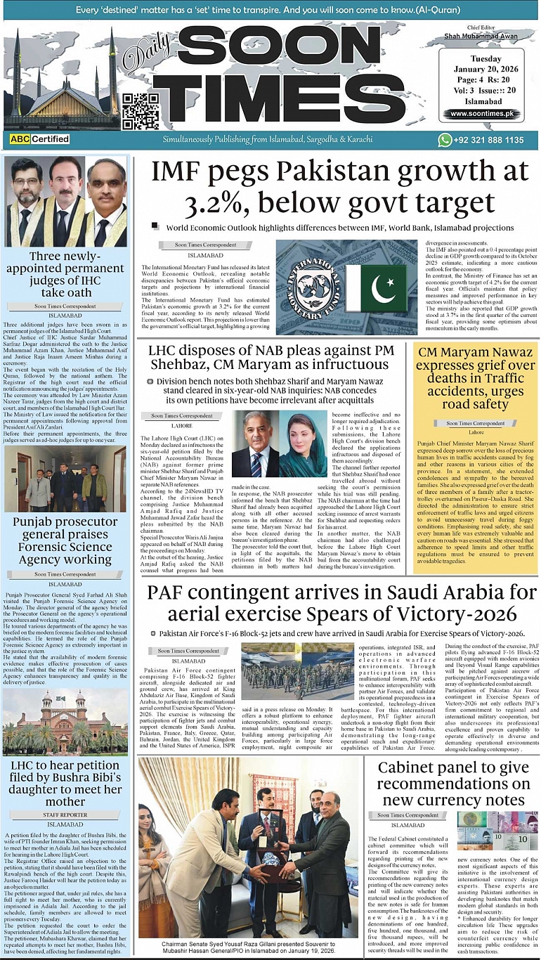 Daily Soon Times January 20, 2026 Daily Soon Times today's ePaper leading English national newspaper from Islamabad, Sargodha, Karachi, Pakistan << First << 1 >> Last >> Page 1Page 2Page 3Page 4 × Daily Soon Times 1.234 1.234 1.