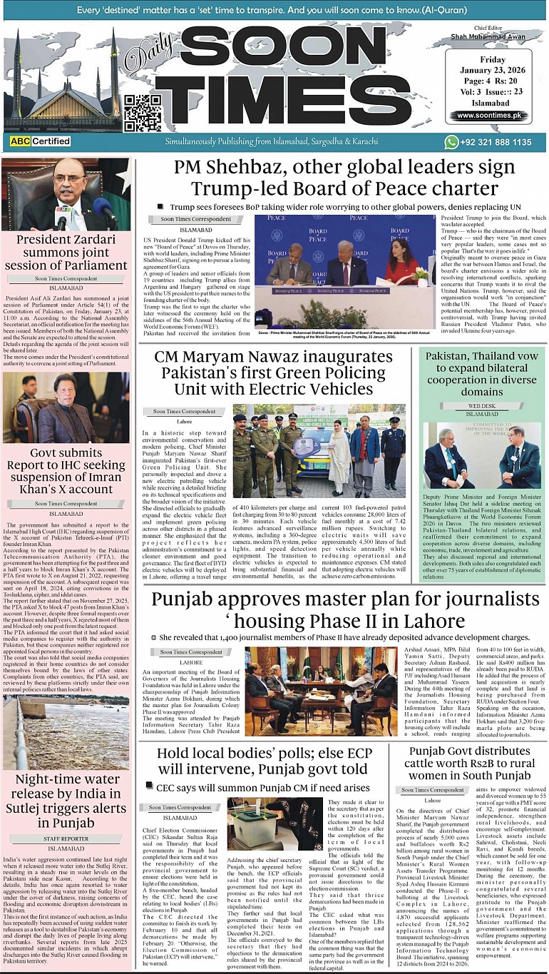Daily Soon Times January 23, 2026 Daily Soon Times today's ePaper leading English national newspaper from Islamabad, Sargodha, Karachi, Pakistan << First << 1 >> Last >> Page 1Page 2Page 3Page 4 × Daily Soon Times 1.23k4 1.23k4 1.
