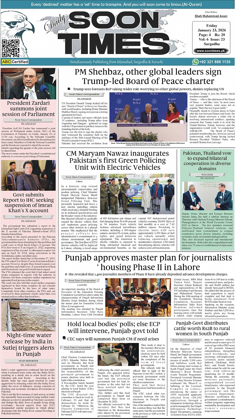 Daily Soon Times today's ePaper leading English national newspaper from Islamabad, Sargodha, Karachi, Pakistan
