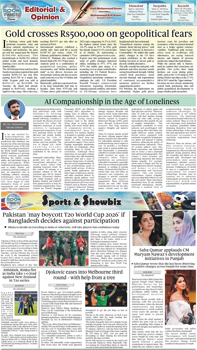 Daily Soon Times Page: 2 January 23, 2026 Daily Soon Times today's ePaper leading English national newspaper from Islamabad, Sargodha, Karachi, Pakistan << First << 2 >> Last >> Page 1Page 2Page 3Page 4 × Daily Soon Times 1k23k4 1k23k4 2