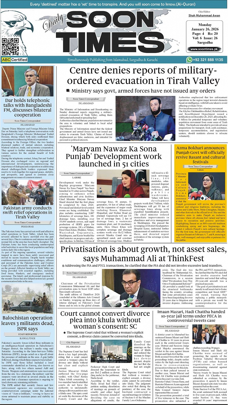 Daily Soon Times January 26, 2026 Daily Soon Times today's ePaper leading English national newspaper from Islamabad, Sargodha, Karachi, Pakistan << First << 1 >> Last >> Page 1Page 2Page 3Page 4 × Daily Soon Times 1234 1234 1