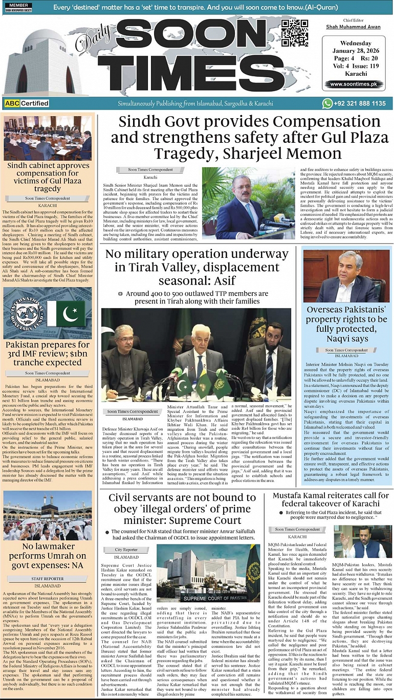 Daily Soon Times January 28, 2026 Daily Soon Times today's ePaper leading English national newspaper from Islamabad, Sargodha, Karachi, Pakistan << First << 1 >> Last >> Page 1Page 2Page 3Page 4 × Daily Soon Times 1k23k4 1k23k4 1k