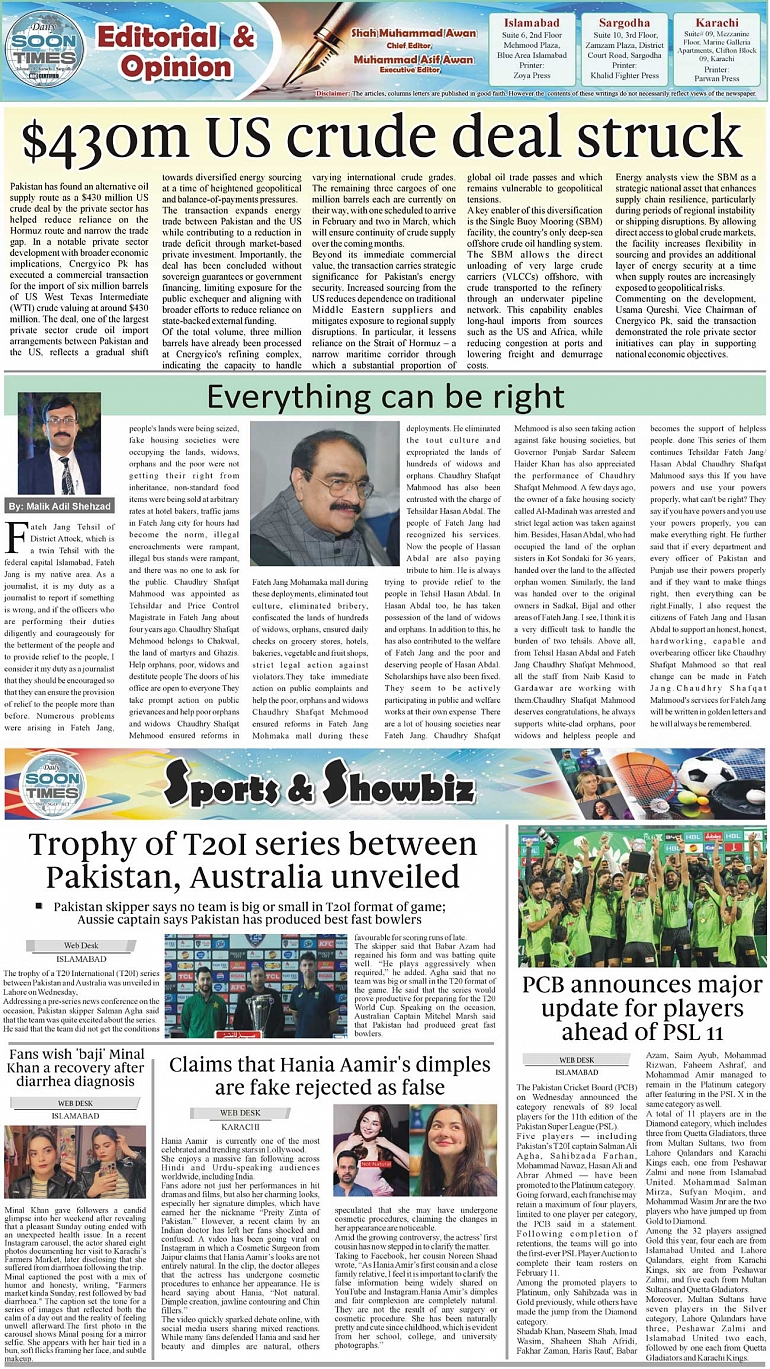 Daily Soon Times Page: 2 January 29, 2026 Daily Soon Times today's ePaper leading English national newspaper from Islamabad, Sargodha, Karachi, Pakistan << First << 2 >> Last >> Page 1Page 2Page 3Page 4 × Daily Soon Times 1234 1234 2