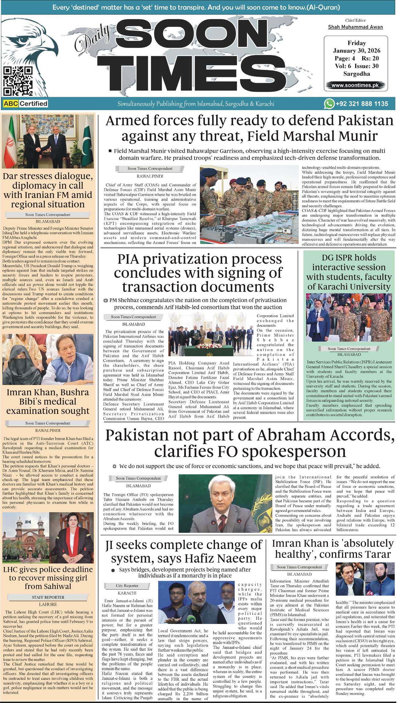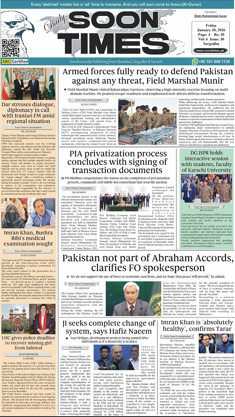Daily Soon Times January 30, 2026 Daily Soon Times today's ePaper leading English national newspaper from Islamabad, Sargodha, Karachi, Pakistan << First << 1 >> Last >> Page 1Page 2Page 3Page 4 × Daily Soon Times 1234 1234 1