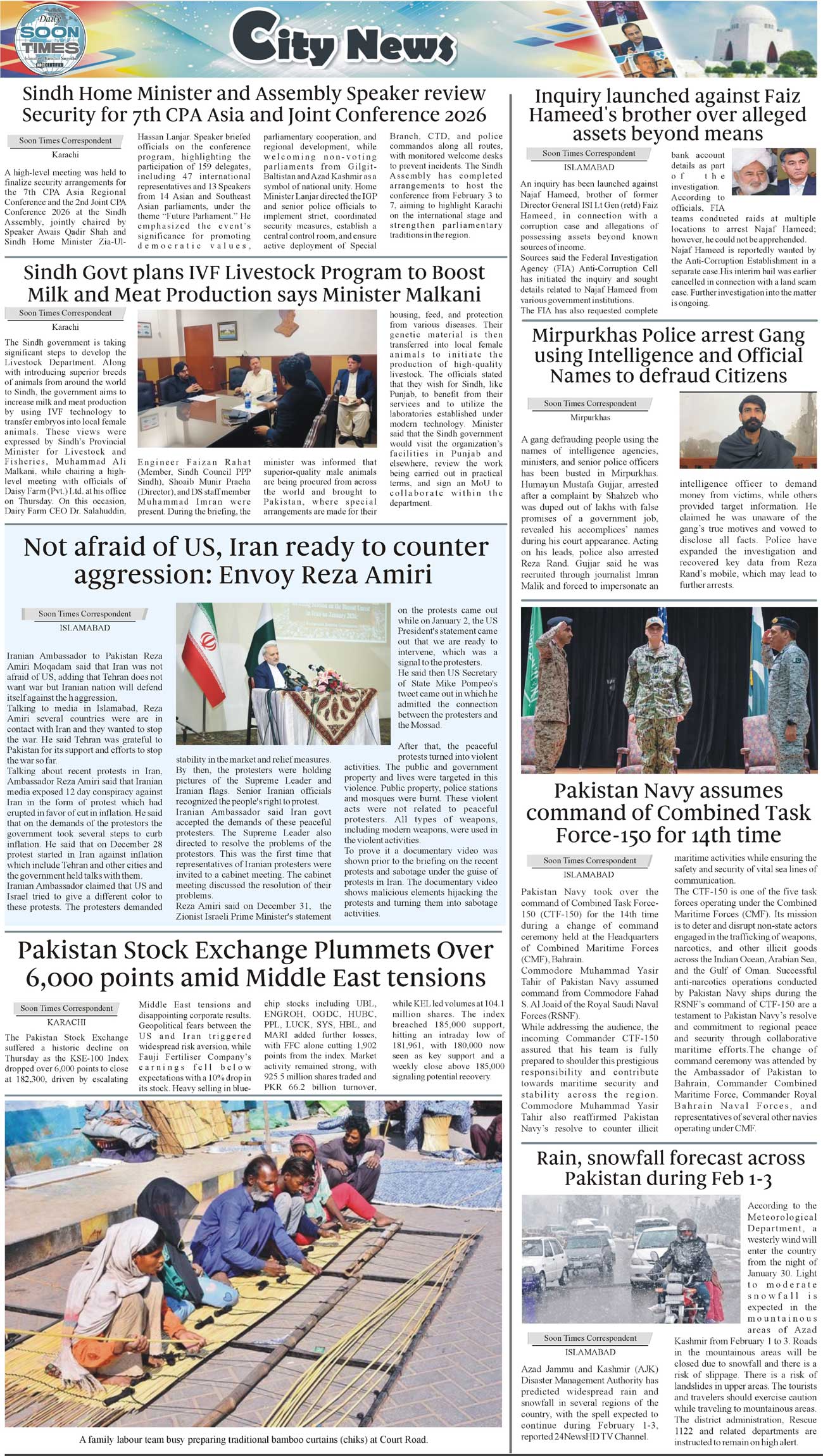 Daily Soon Times Page: 3 January 30, 2026 Daily Soon Times today's ePaper leading English national newspaper from Islamabad, Sargodha, Karachi, Pakistan << First << 3 >> Last >> Page 1Page 2Page 3Page 4 × Daily Soon Times 1k23k4k 1k23k4k 3k