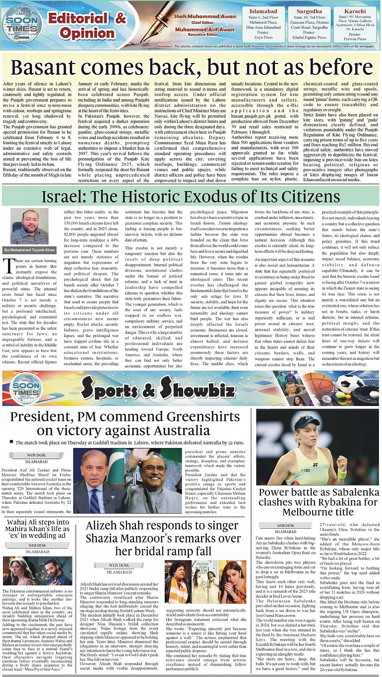 Daily Soon Times Page: 2 January 31, 2026 Daily Soon Times today's ePaper leading English national newspaper from Islamabad, Sargodha, Karachi, Pakistan << First << 2 >> Last >> Page 1Page 2Page 3Page 4 × Daily Soon Times 1.234 1.234 2