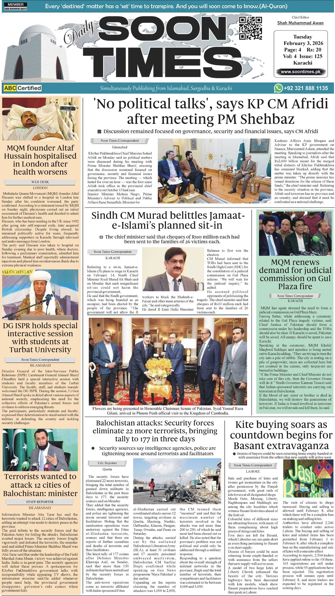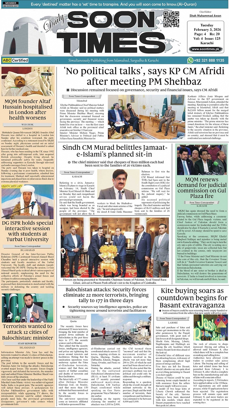 Daily Soon Times February 03, 2026 Daily Soon Times today's ePaper leading English national newspaper from Islamabad, Sargodha, Karachi, Pakistan << First << 1 >> Last >> Page 1Page 2Page 3Page 4 × Daily Soon Times 1k23k4k 1k23k4k 1k