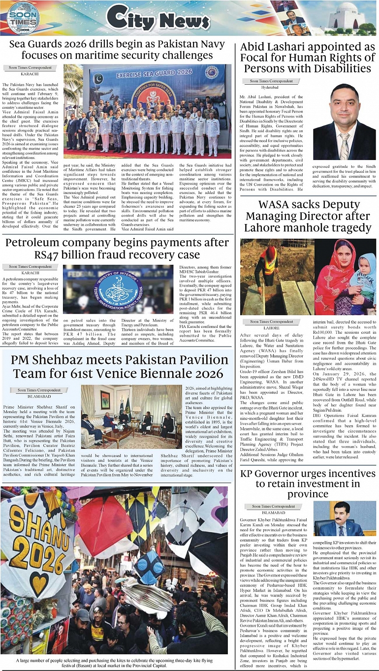 Daily Soon Times Page: 3 February 03, 2026 Daily Soon Times today's ePaper leading English national newspaper from Islamabad, Sargodha, Karachi, Pakistan << First << 3 >> Last >> Page 1Page 2Page 3Page 4 × Daily Soon Times 1k23k4k 1k23k4k 3k
