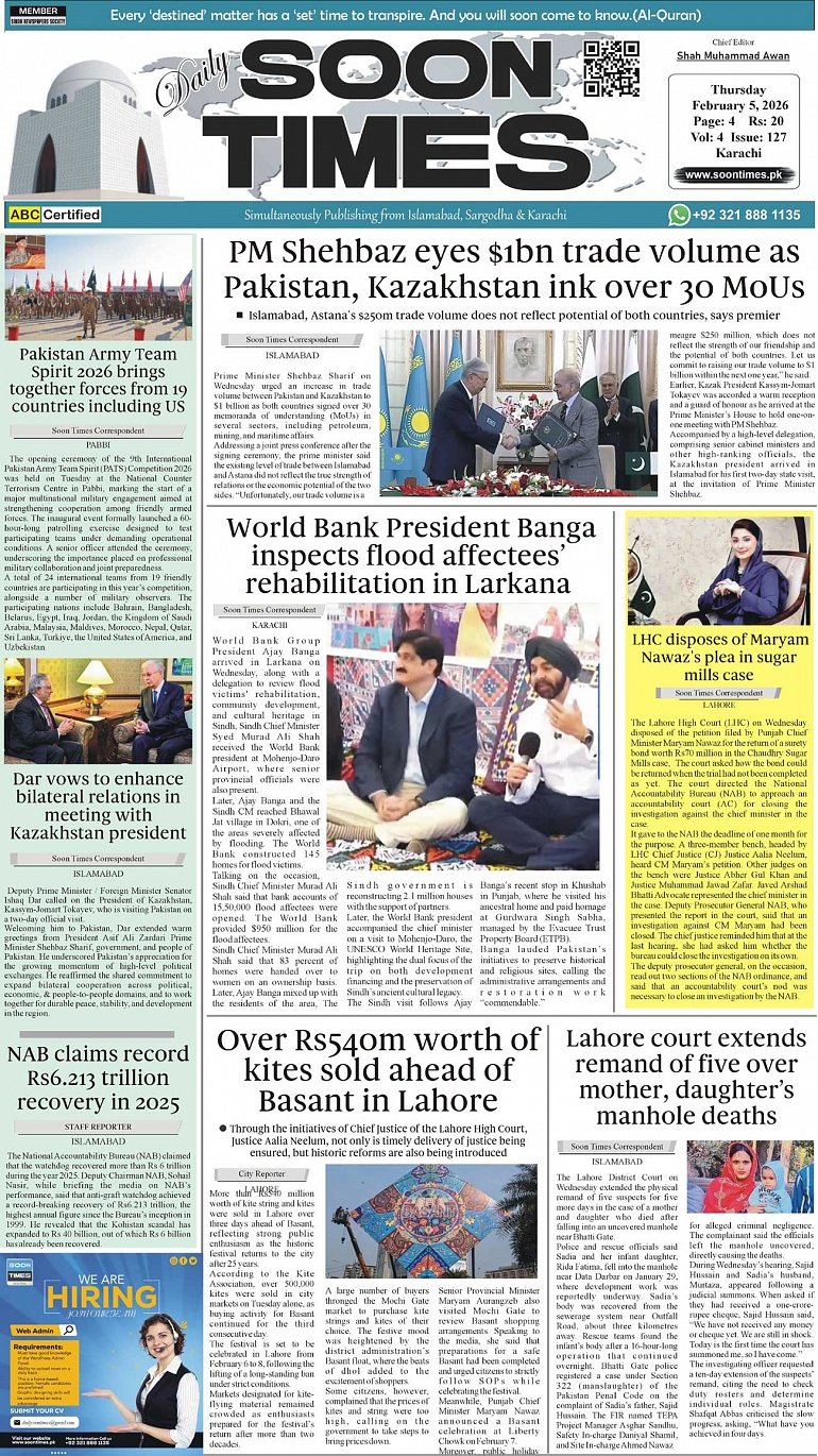 Daily Soon Times February 05, 2026 Daily Soon Times today's ePaper leading English national newspaper from Islamabad, Sargodha, Karachi, Pakistan << First << 1 >> Last >> Page 1Page 2Page 3Page 4 × Daily Soon Times 1k23k4 1k23k4 1k