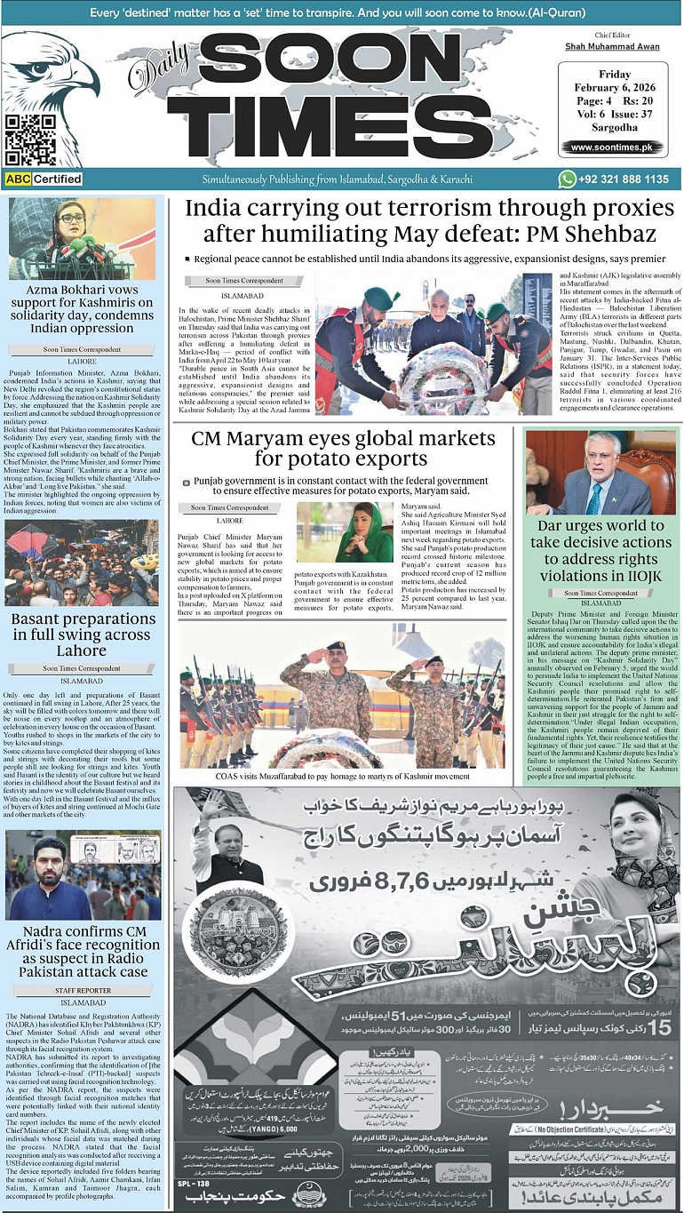 Daily Soon Times today's ePaper leading English national newspaper from Islamabad, Sargodha, Karachi, Pakistan