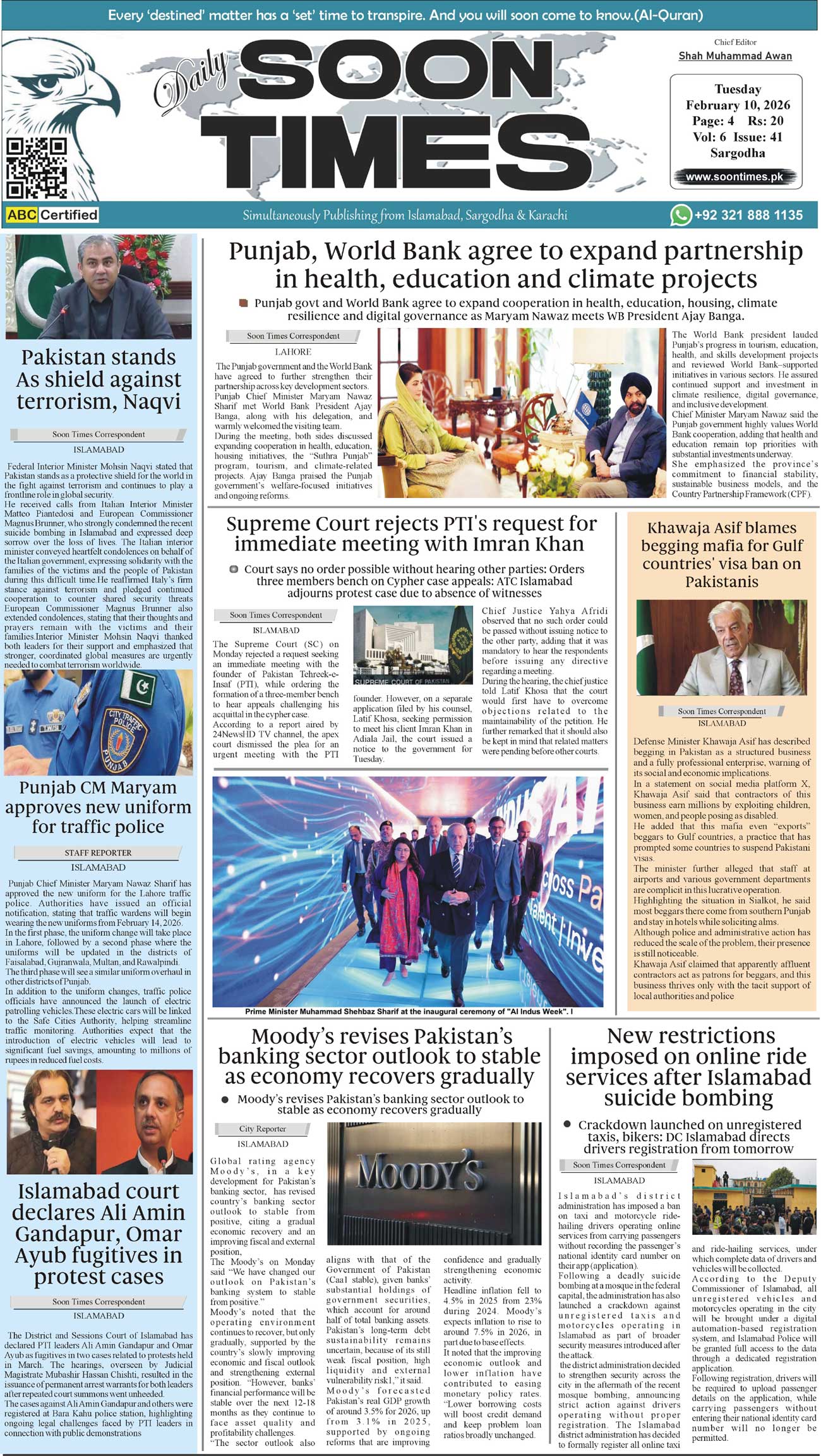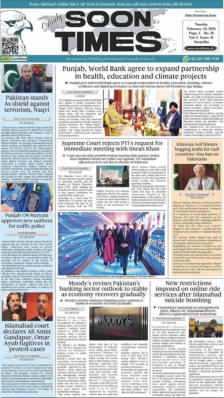 Daily Soon Times February 10, 2026 Daily Soon Times today's ePaper leading English national newspaper from Islamabad, Sargodha, Karachi, Pakistan << First << 1 >> Last >> Page 1Page 2Page 3Page 4 × Daily Soon Times 1234 1234 1