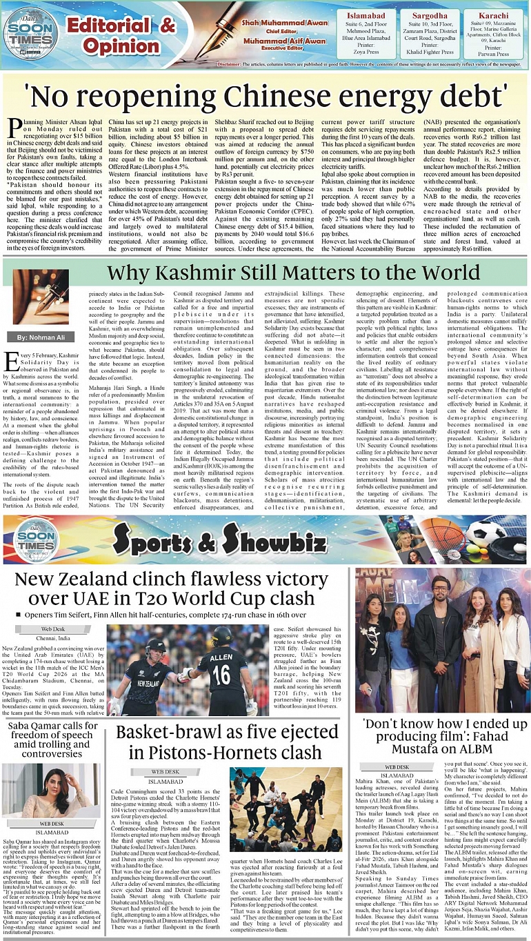 Daily Soon Times Page: 2 February 11, 2026 Daily Soon Times today's ePaper leading English national newspaper from Islamabad, Sargodha, Karachi, Pakistan << First << 2 >> Last >> Page 1Page 2Page 3Page 4 × Daily Soon Times 1234 1234 2