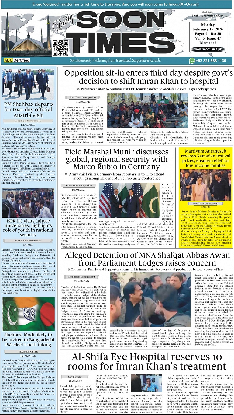 Daily Soon Times February 16, 2026 Daily Soon Times today's ePaper leading English national newspaper from Islamabad, Sargodha, Karachi, Pakistan << First << 1 >> Last >> Page 1Page 2Page 3Page 4 × Daily Soon Times 1.2k34 1.2k34 1.