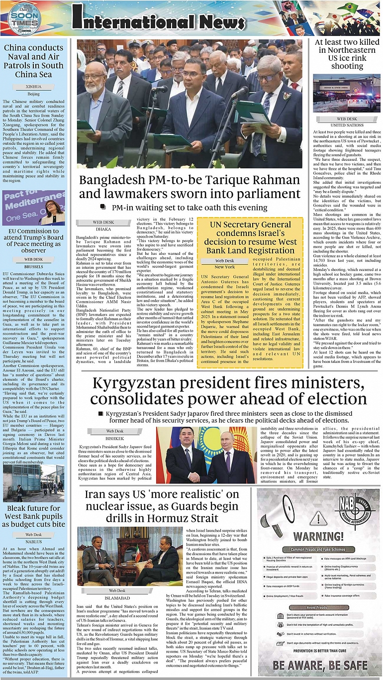 Daily Soon Times Page: 4 February 18, 2026 Daily Soon Times today's ePaper leading English national newspaper from Islamabad, Sargodha, Karachi, Pakistan << First << 4 >> Last >> Page 1Page 2Page 3Page 4 × Daily Soon Times 1234 1234 4