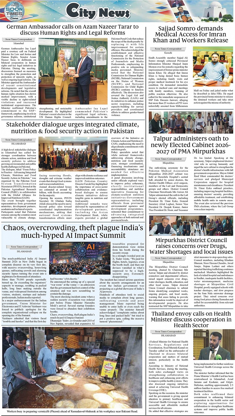 Daily Soon Times Page: 3 February 18, 2026 Daily Soon Times today's ePaper leading English national newspaper from Islamabad, Sargodha, Karachi, Pakistan << First << 3 >> Last >> Page 1Page 2Page 3Page 4 × Daily Soon Times 1k23k4 1k23k4 3k