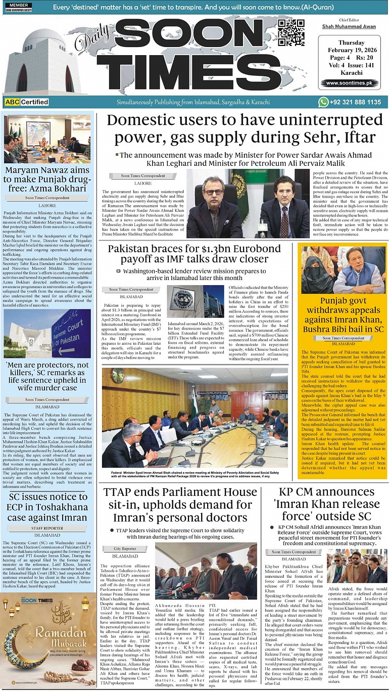 Daily Soon Times February 19, 2026 Daily Soon Times today's ePaper leading English national newspaper from Islamabad, Sargodha, Karachi, Pakistan << First << 1 >> Last >> Page 1Page 2Page 3Page 4 × Daily Soon Times 1k23k4 1k23k4 1k