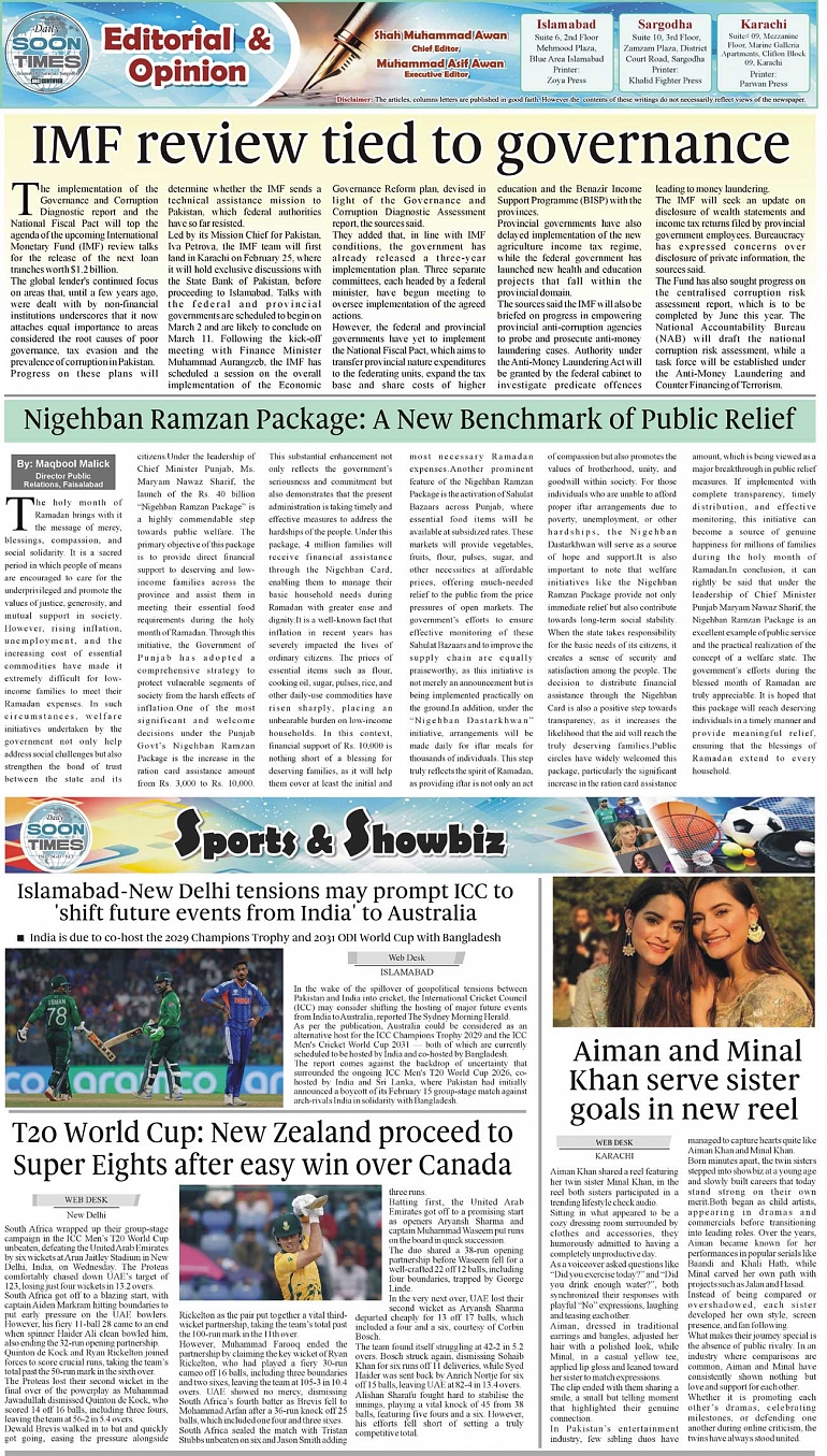 Daily Soon Times Page: 2 February 19, 2026 Daily Soon Times today's ePaper leading English national newspaper from Islamabad, Sargodha, Karachi, Pakistan << First << 2 >> Last >> Page 1Page 2Page 3Page 4 × Daily Soon Times 1234 1234 2