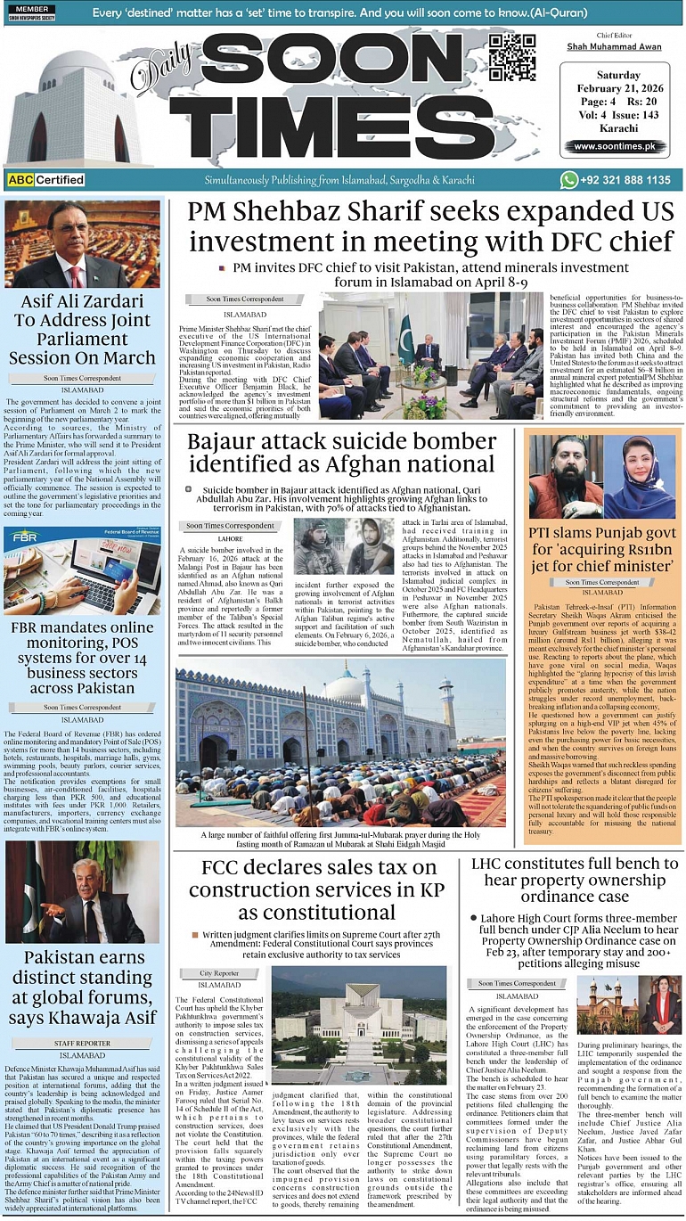 Daily Soon Times today's ePaper leading English national newspaper from Islamabad, Sargodha, Karachi, Pakistan