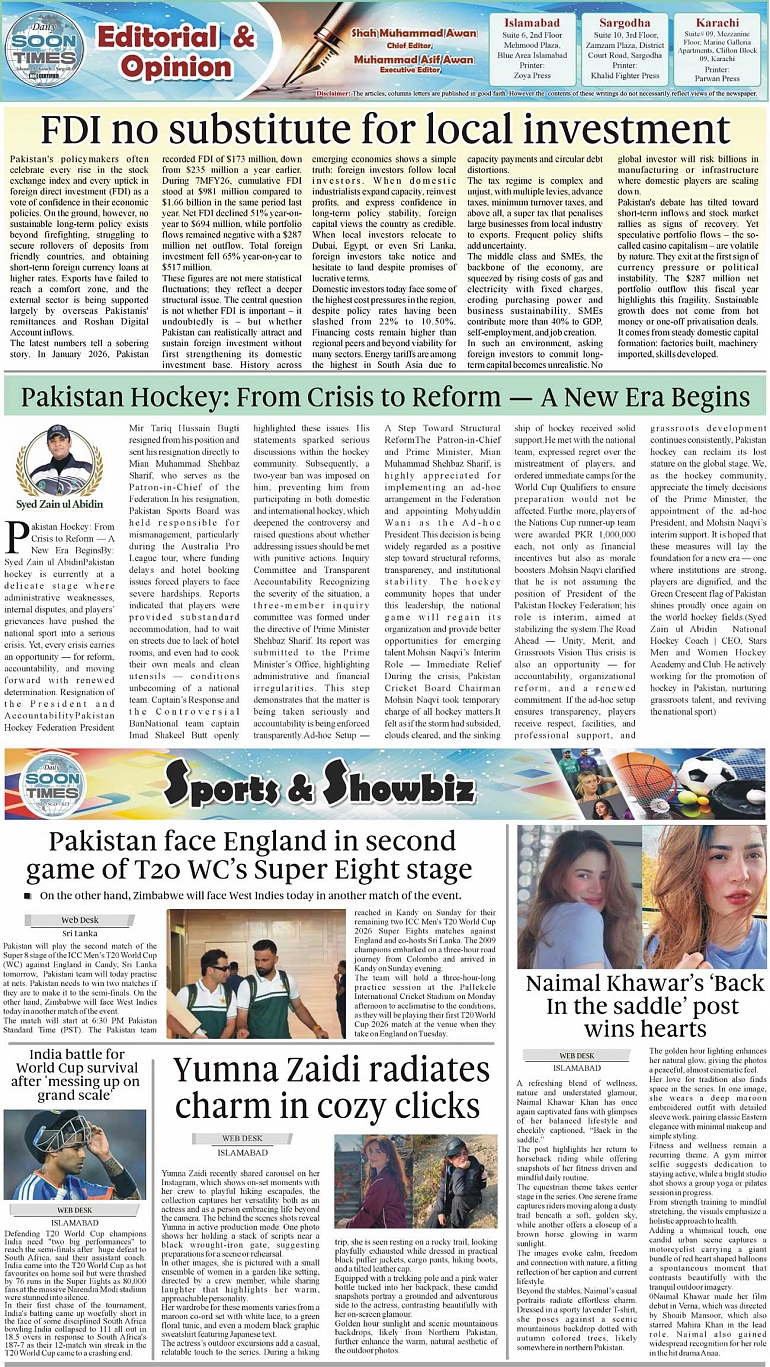 Daily Soon Times Page: 2 February 24, 2026 Daily Soon Times today's ePaper leading English national newspaper from Islamabad, Sargodha, Karachi, Pakistan << First << 2 >> Last >> Page 1Page 2Page 3Page 4 × Daily Soon Times 1k23k4 1k23k4 2