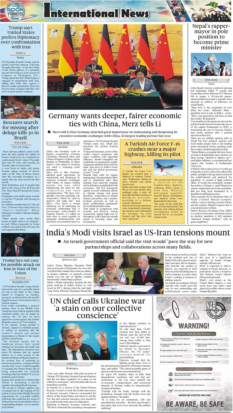 Daily Soon Times Page: 4 February 26, 2026 Daily Soon Times today's ePaper leading English national newspaper from Islamabad, Sargodha, Karachi, Pakistan << First << 4 >> Last >> Page 1Page 2Page 3Page 4 × Daily Soon Times 1234 1234 4