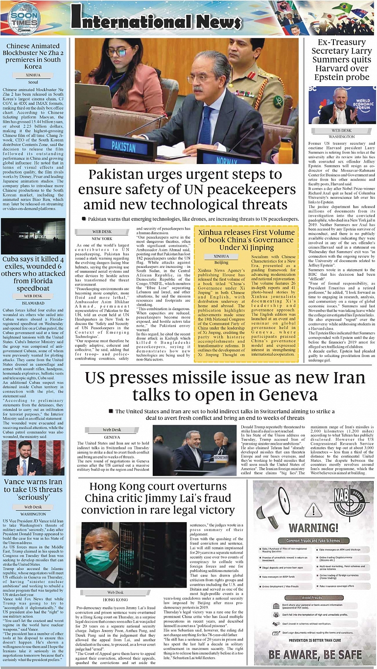 Daily Soon Times Page: 4 February 27, 2026 Daily Soon Times today's ePaper leading English national newspaper from Islamabad, Sargodha, Karachi, Pakistan << First << 4 >> Last >> Page 1Page 2Page 3Page 4 × Daily Soon Times 1k23k4 1k23k4 4