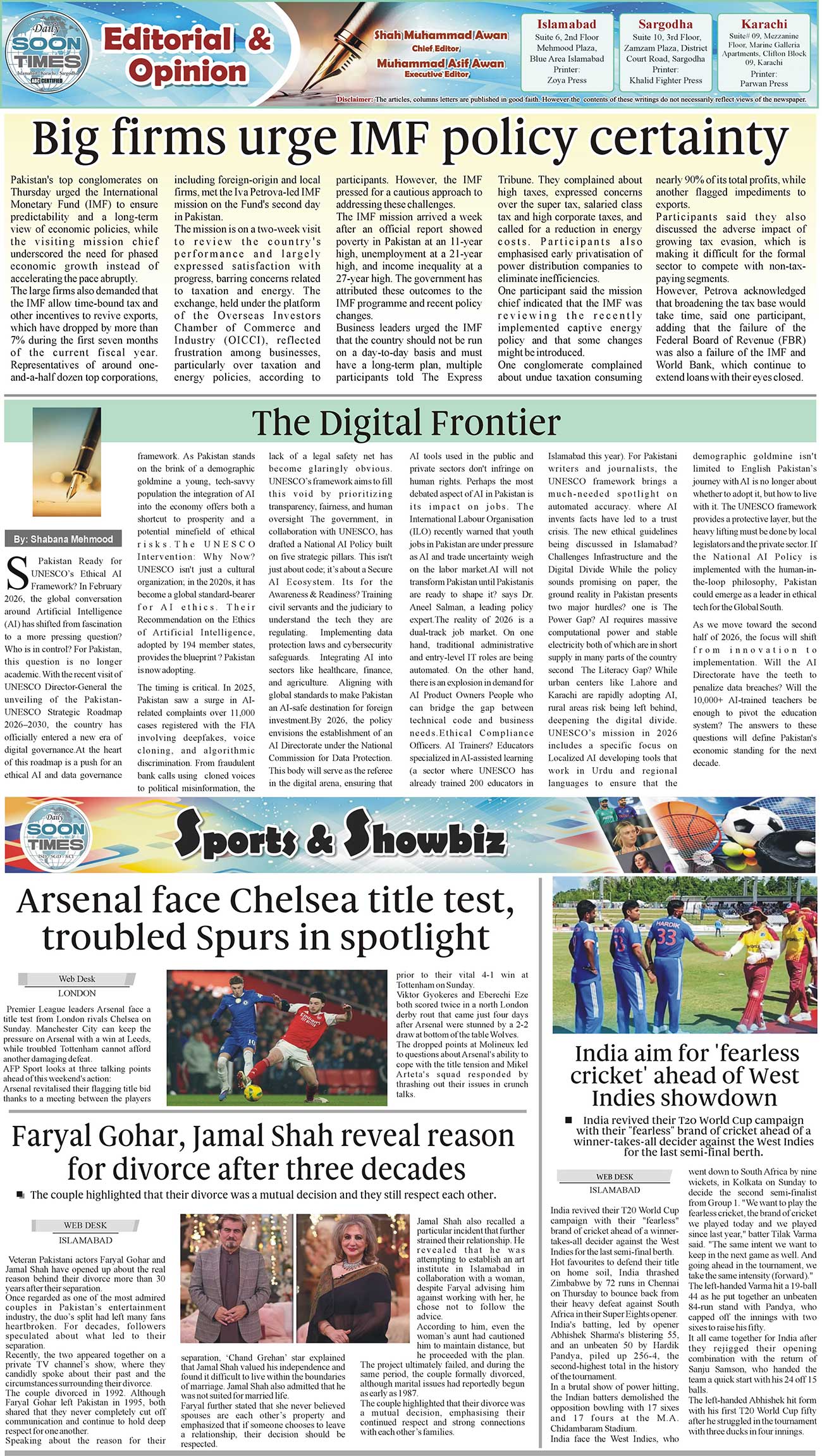 Daily Soon Times Page: 2 February 28, 2026 Daily Soon Times today's ePaper leading English national newspaper from Islamabad, Sargodha, Karachi, Pakistan << First << 2 >> Last >> Page 1Page 2Page 3Page 4 × Daily Soon Times 1234 1234 2
