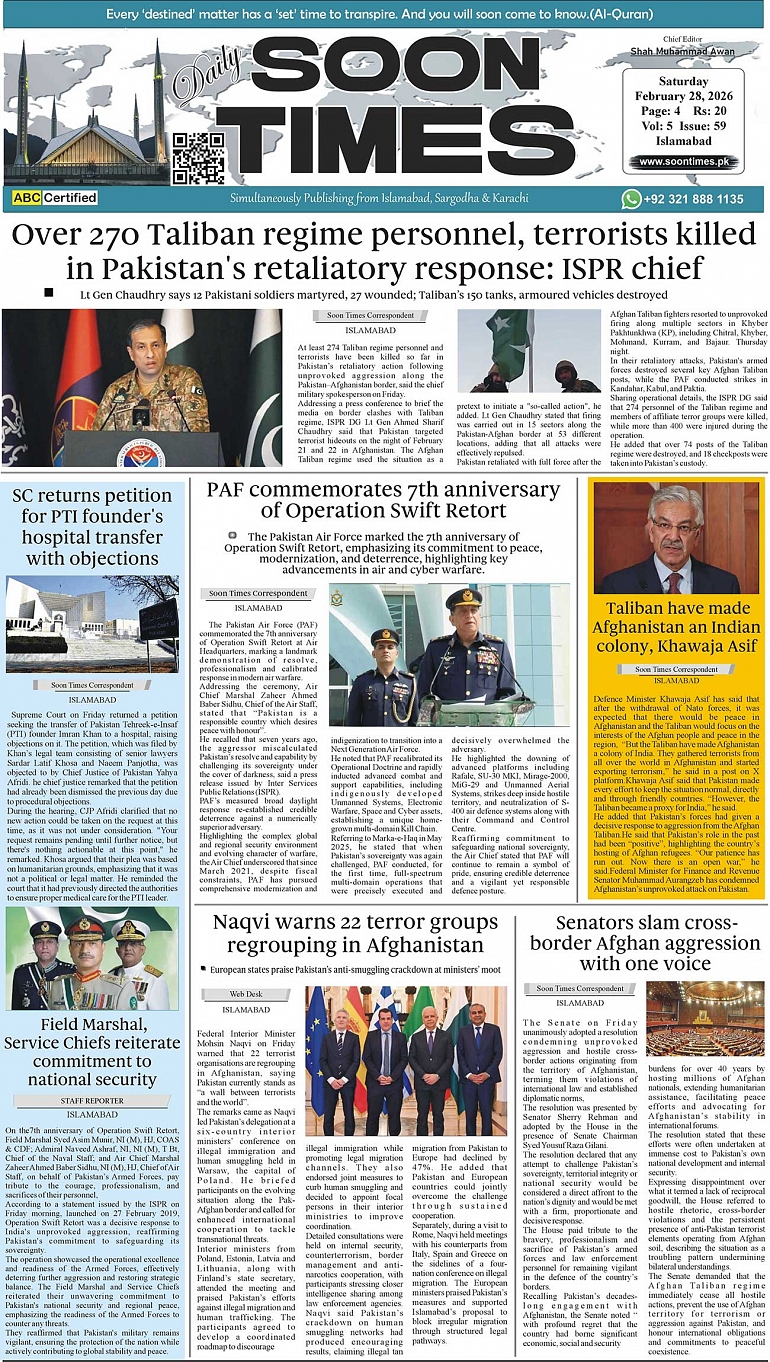 Daily Soon Times today's ePaper leading English national newspaper from Islamabad, Sargodha, Karachi, Pakistan