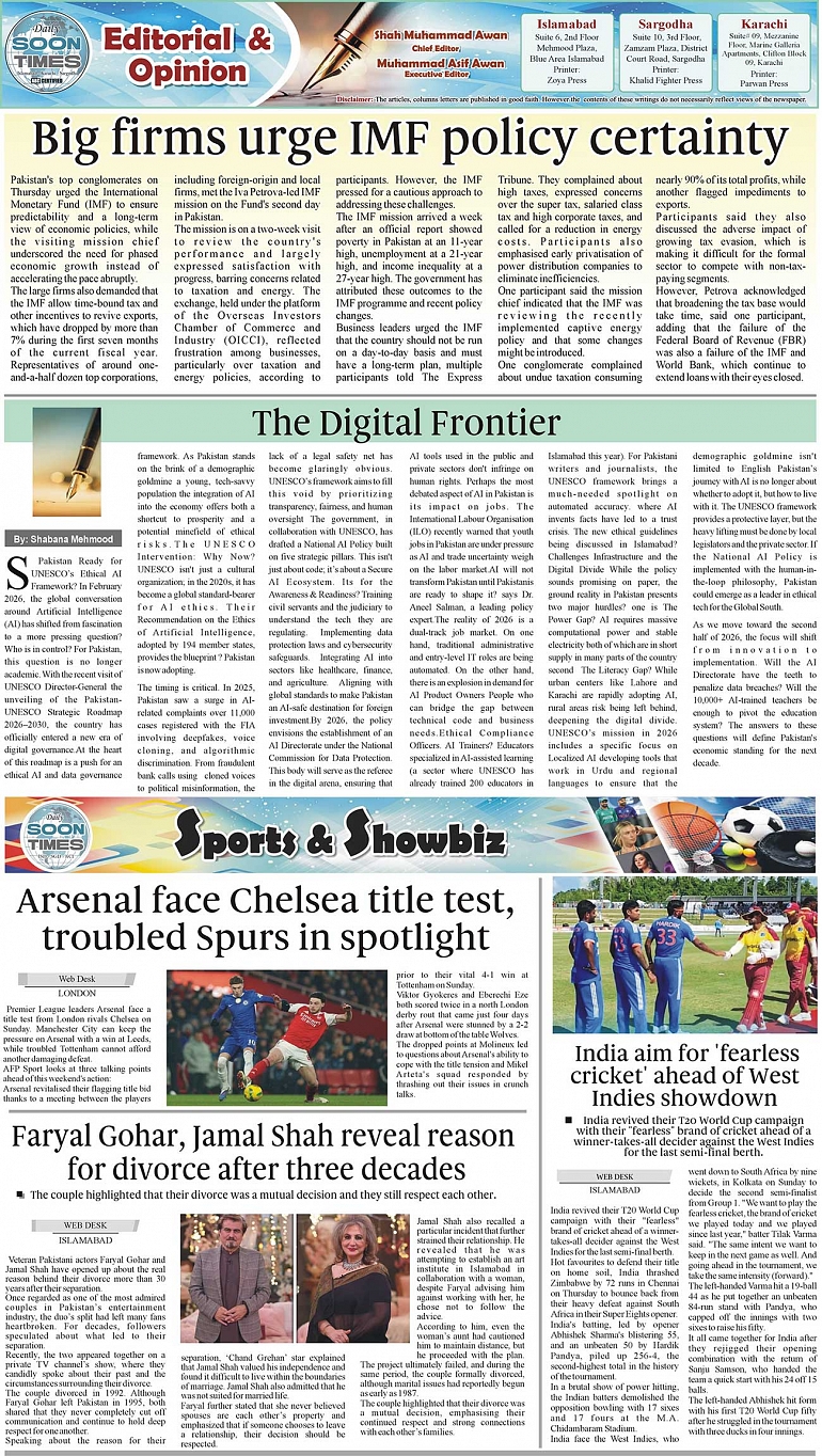 Daily Soon Times Page: 2 February 28, 2026 Daily Soon Times today's ePaper leading English national newspaper from Islamabad, Sargodha, Karachi, Pakistan << First << 2 >> Last >> Page 1Page 2Page 3Page 4 × Daily Soon Times 1k23k4 1k23k4 2