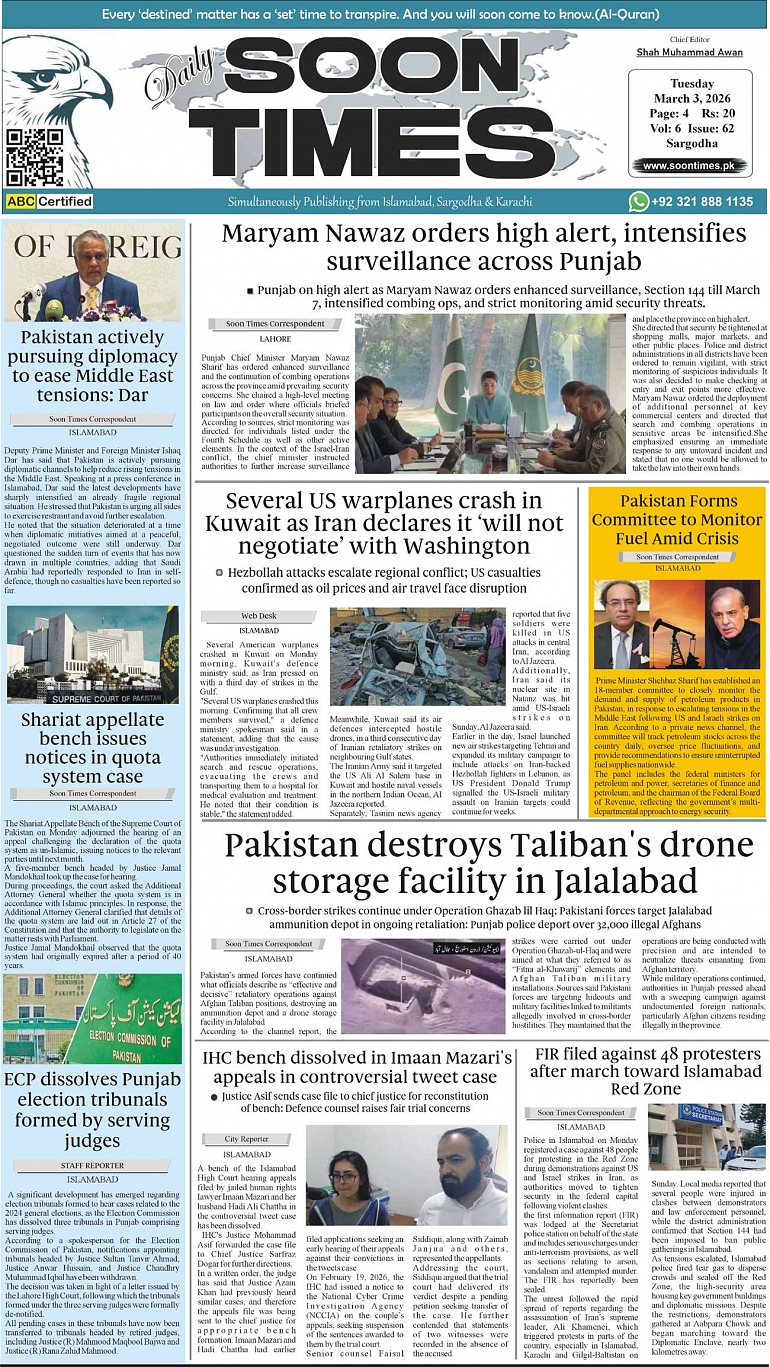 Daily Soon Times March 03, 2026 Daily Soon Times today's ePaper leading English national newspaper from Islamabad, Sargodha, Karachi, Pakistan << First << 1 >> Last >> Page 1Page 2Page 3Page 4 × Daily Soon Times 1234 1234 1