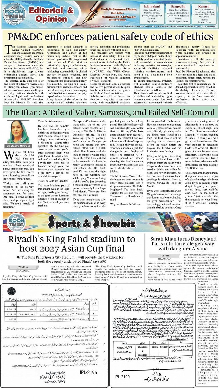 Daily Soon Times Page: 2 March 03, 2026 Daily Soon Times today's ePaper leading English national newspaper from Islamabad, Sargodha, Karachi, Pakistan << First << 2 >> Last >> Page 1Page 2Page 3Page 4 × Daily Soon Times 1234 1234 2