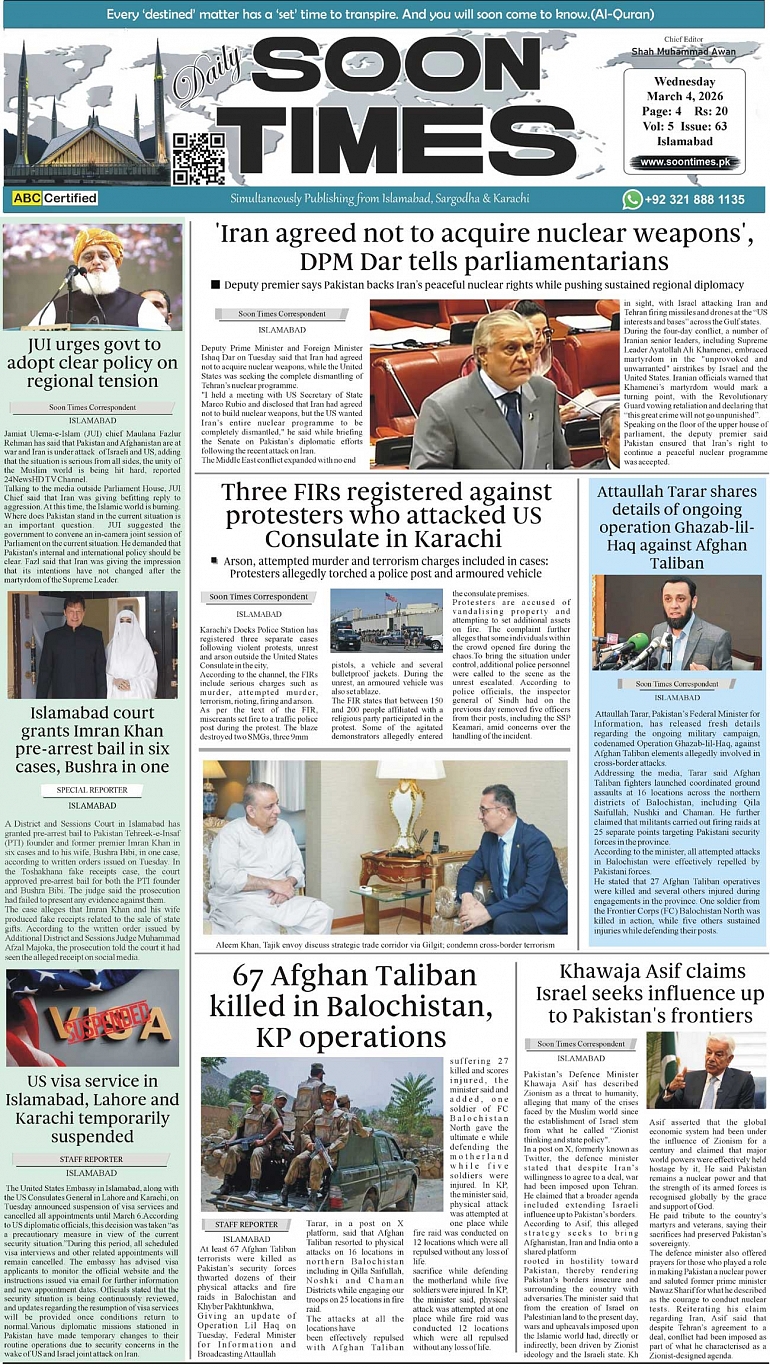 Daily Soon Times March 04, 2026 Daily Soon Times today's ePaper leading English national newspaper from Islamabad, Sargodha, Karachi, Pakistan << First << 1 >> Last >> Page 1Page 2Page 3Page 4 × Daily Soon Times 1.234 1.234 1.