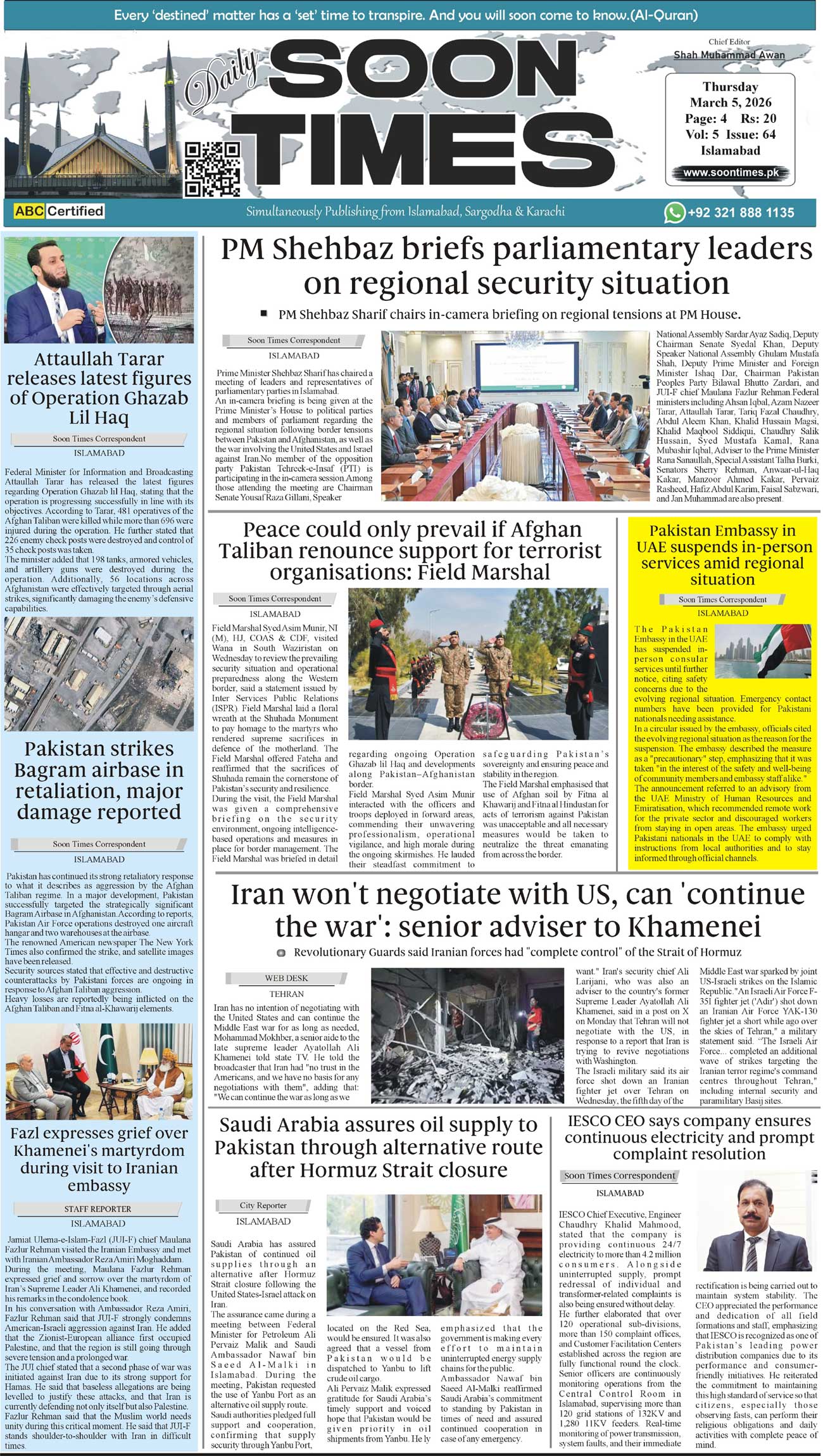 Daily Soon Times March 05, 2026 Daily Soon Times today's ePaper leading English national newspaper from Islamabad, Sargodha, Karachi, Pakistan << First << 1 >> Last >> Page 1Page 2Page 3Page 4 × Daily Soon Times 1.2.34 1.2.34 1.