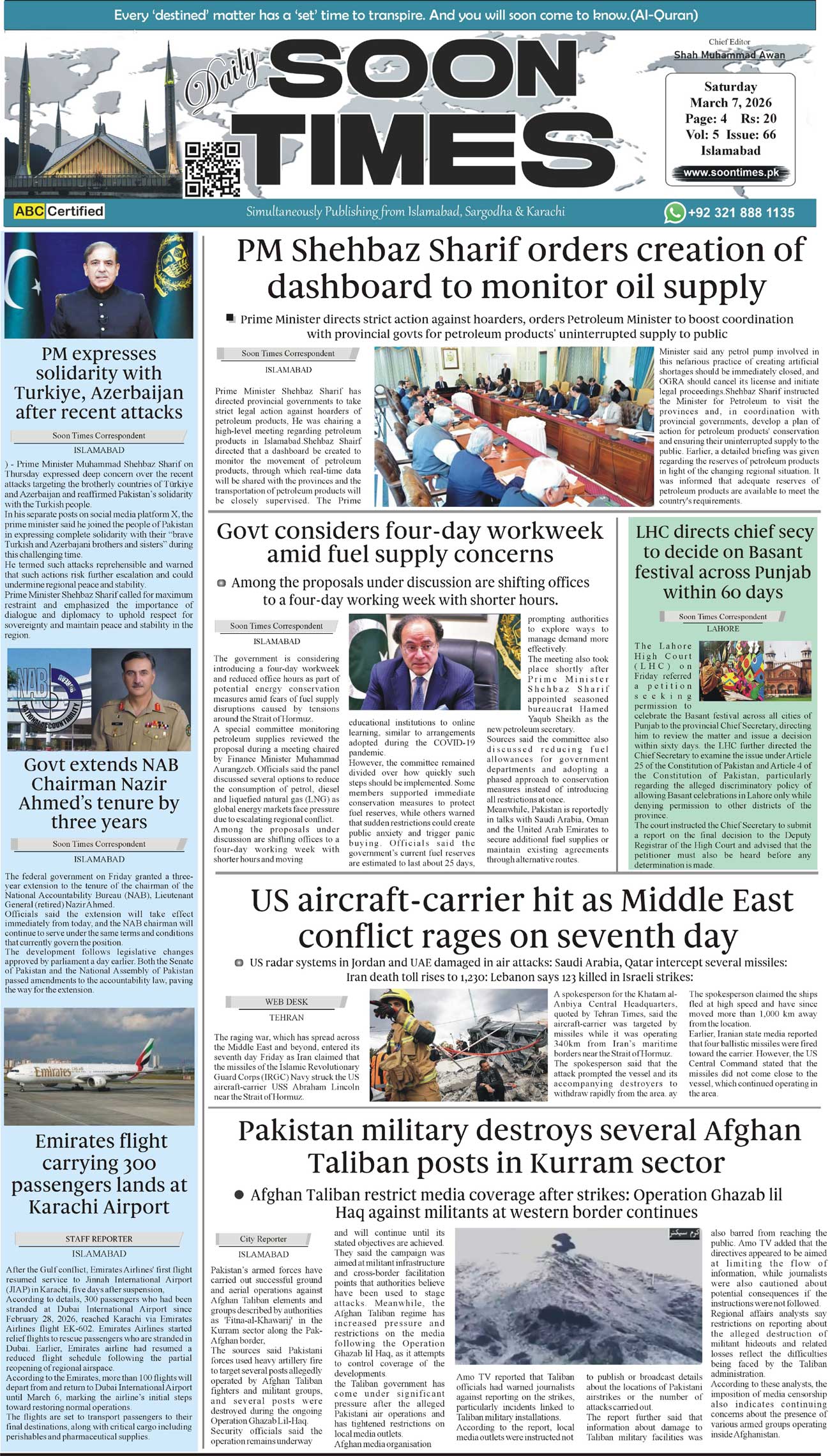 Daily Soon Times March 07, 2026 Daily Soon Times today's ePaper leading English national newspaper from Islamabad, Sargodha, Karachi, Pakistan << First << 1 >> Last >> Page 1Page 2Page 3Page 4 × Daily Soon Times 1.234 1.234 1.