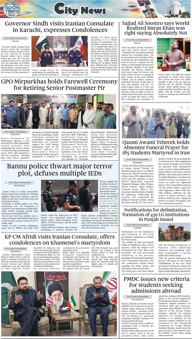 Daily Soon Times Page: 3 March 07, 2026 Daily Soon Times today's ePaper leading English national newspaper from Islamabad, Sargodha, Karachi, Pakistan << First << 3 >> Last >> Page 1Page 2Page 3Page 4 × Daily Soon Times 1k23k4 1k23k4 3k