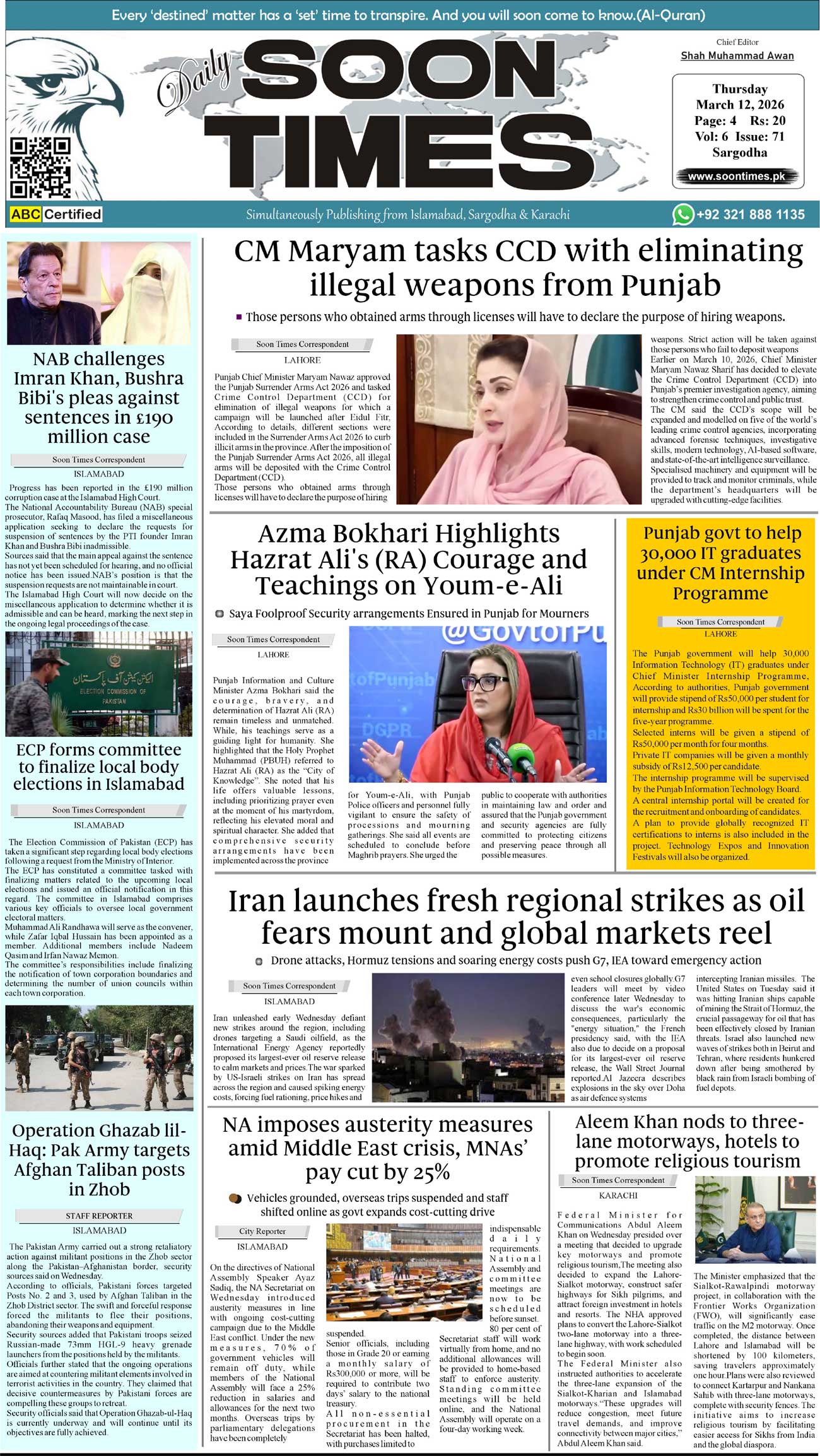 Daily Soon Times March 12, 2026 Daily Soon Times today's ePaper leading English national newspaper from Islamabad, Sargodha, Karachi, Pakistan << First << 1 >> Last >> Page 1Page 2Page 3Page 4 × Daily Soon Times 1234 1234 1