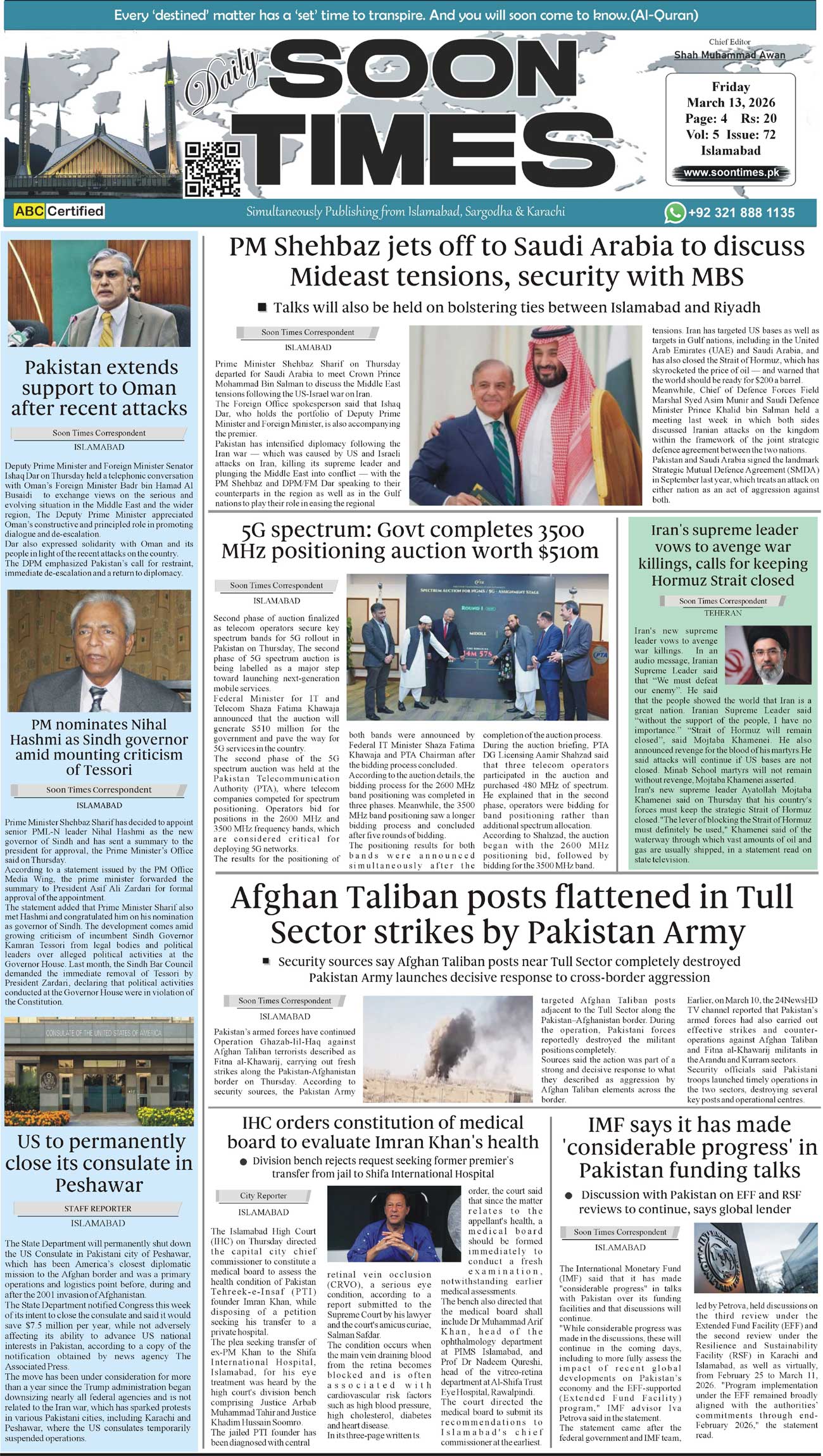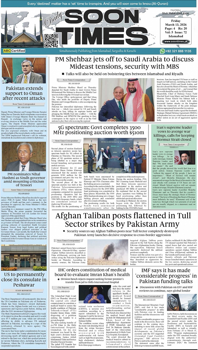 Daily Soon Times March 13, 2026 Daily Soon Times today's ePaper leading English national newspaper from Islamabad, Sargodha, Karachi, Pakistan << First << 1 >> Last >> Page 1Page 2Page 3Page 4 × Daily Soon Times 1.2.34 1.2.34 1.