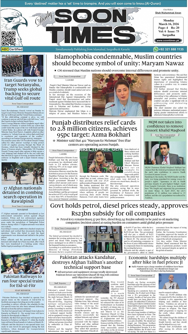 Daily Soon Times March 16, 2026 Daily Soon Times today's ePaper leading English national newspaper from Islamabad, Sargodha, Karachi, Pakistan << First << 1 >> Last >> Page 1Page 2Page 3Page 4 × Daily Soon Times 1234 1234 1