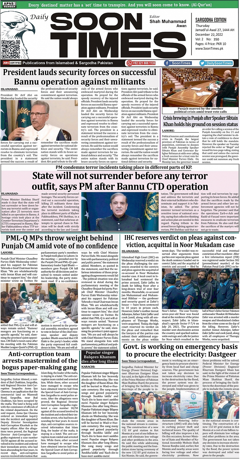 Today's ePaper December 22, 2022 Daily Soon Times Today's ePaper Islamabad, Sargodha and Karachi Pakistan << First << 1 >> Last >> Page 1Page 2Page 3Page 4 × Today's ePaper Front PageEditorial PageRegional NewsInternational News Full PDF Front PageEditorial PageRegional NewsInternational News Front Page