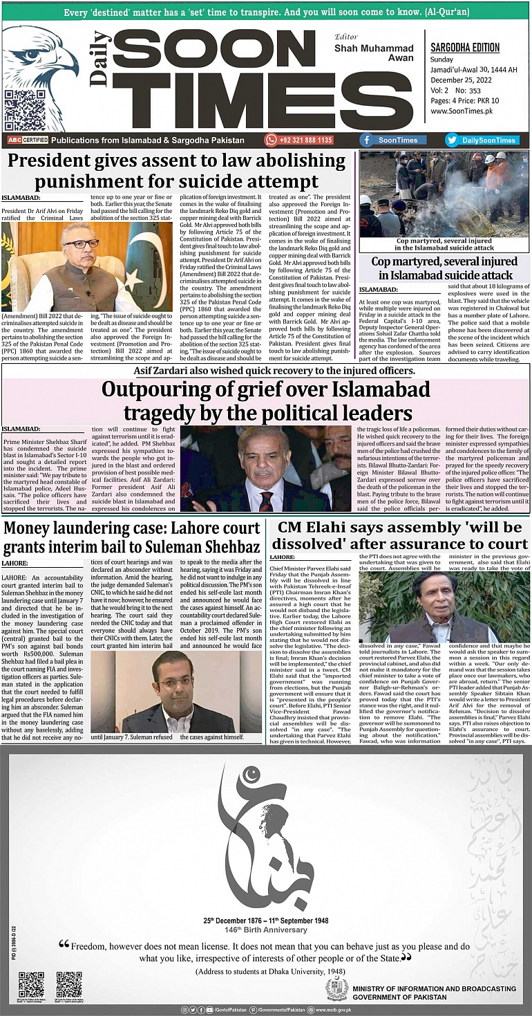 Daily Soon Times December 24, 2022 Daily Soon Times Sargodha << First << 1 >> Last >> Page 1Page 2Page 3Page 4Page 5 × Daily Soon Times Quaid Azam DayFront-PageEditorial-and-OpinionRegional-NewsInternational-News Full PDF Quaid Azam DayFront-PageEditorial-and-OpinionRegional-NewsInternational-News Quaid Azam Day