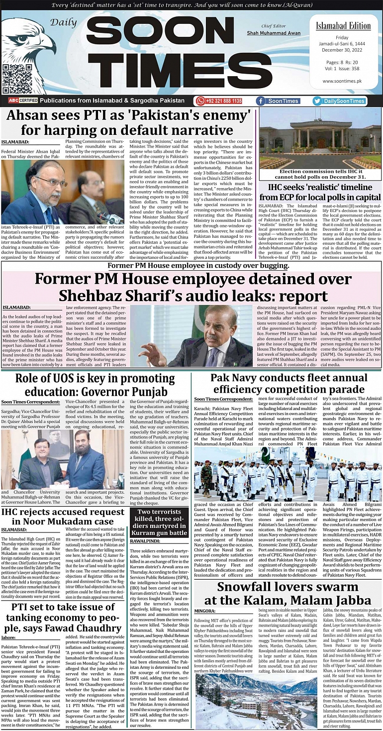 Daily Soon Times December 30, 2022 Today's ePaper Daily Soon Times Islamabad Pakistan << First << 1 >> Last >> Page 1Page 2Page 3Page 4 × Daily Soon Times 1234 Full PDF 1234 1