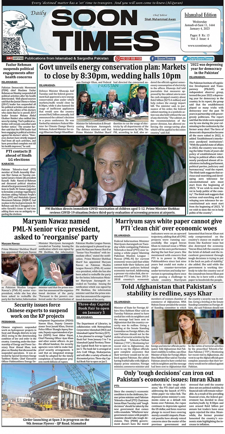 Daily Soon Times January 04, 2023 Today's ePaper Islamabad Edition << First << 1 >> Last >> Page 1Page 2Page 3Page 4Page 5Page 6Page 7Page 8 × Daily Soon Times 12345678 Full PDF 12345678 1