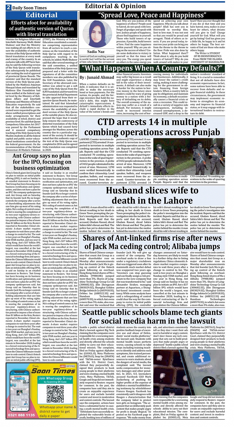 Daily Soon Times Page: 2 January 10, 2023 Today's ePaper Islamabad Edition << First << 2 >> Last >> Page 1Page 2Page 3Page 4Page 5Page 6Page 7Page 8 × Daily Soon Times 12345678 Full PDF 12345678 2