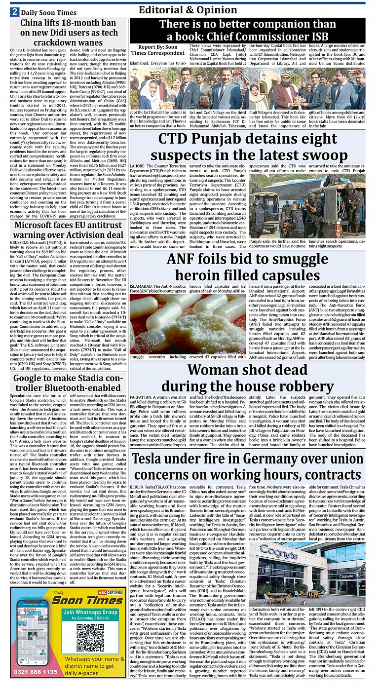 Daily Soon Times Page: 2 January 17, 2023 Today's ePaper Islamabad Edition << First << 2 >> Last >> Page 1Page 2Page 3Page 4Page 5Page 6Page 7Page 8 × Daily Soon Times 12345678 Full PDF 12345678 2