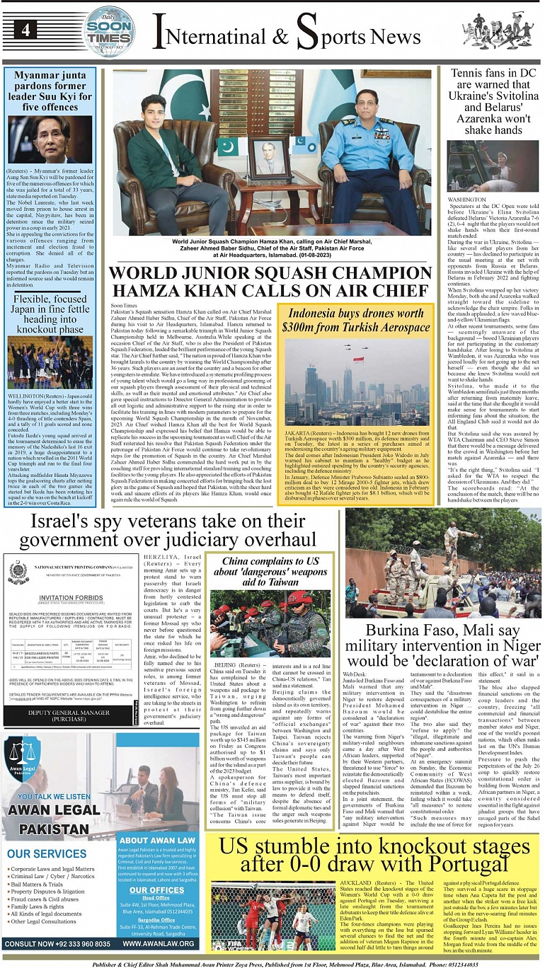 Daily Soon Times Page: 4 August 02, 2023 Daily Soon Times Today's ePaper Leading English Newspaper from Islamabad, Sargodha, Karachi << First << 4 >> Last >> Page 1Page 2Page 3Page 4 × Daily Soon Times 1234 1234 4